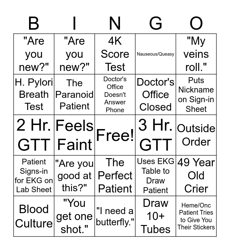 This bingo card has a free space and 35 words: Called Patient 3x, Still No Answer, Doctor's Office Closed, Only Puts Name on Sign-in Sheet, The Paranoid Patient, The Perfect Patient, Nauseous/Queasy, H. Pylori Breath Test, Harmony Test, Doctor's Office Doesn't Answer Phone, 1 Hr. GTT, 2 Hr. GTT, "My veins roll.", "Good luck.", No Orders, "Are you new?", 3 Hr. GTT, Draw 10+ Tubes, Feels Faint, Patient Signs-in for EKG on Lab Sheet, Heme/Onc Patient Tries to Give You Their Stickers, Uses EKG Table to Draw Patient, Blood Culture, 49 Year Old Crier, "You get one shot.", 4K Score Test, Puts Nickname on Sign-in Sheet, Covered in Tattoos, Hates Needles, Patient signs-in for Lab on EKG sheet, Doctor's Office Closed, Outside Order, Pediatric Draw, "I need a butterfly.", "Are you good at this?", "Are you new?" and Can't Read Handwriting.