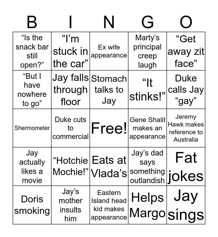 This bingo card has a free space and 24 words: “Hotchie Mochie!”, Jay’s mother insults him, Stomach talks to Jay, Doris smoking, “Get away zit face”, “Is the snack bar still open?”, “But I have nowhere to go”, “I’m stuck in the car”, Gene Shalit makes an appearance, Eats at Vlada’s, “It stinks!”, Shermometer, Jay’s dad says something outlandish, Fat jokes, Jay falls through floor, Helps Margo, Jeremy Hawk makes reference to Australia, Ex wife appearance, Duke calls Jay “gay”, Duke cuts to commercial, Jay sings, Jay actually likes a movie, Marty’s principal creep laugh and Eastern Island head kid makes appearance.