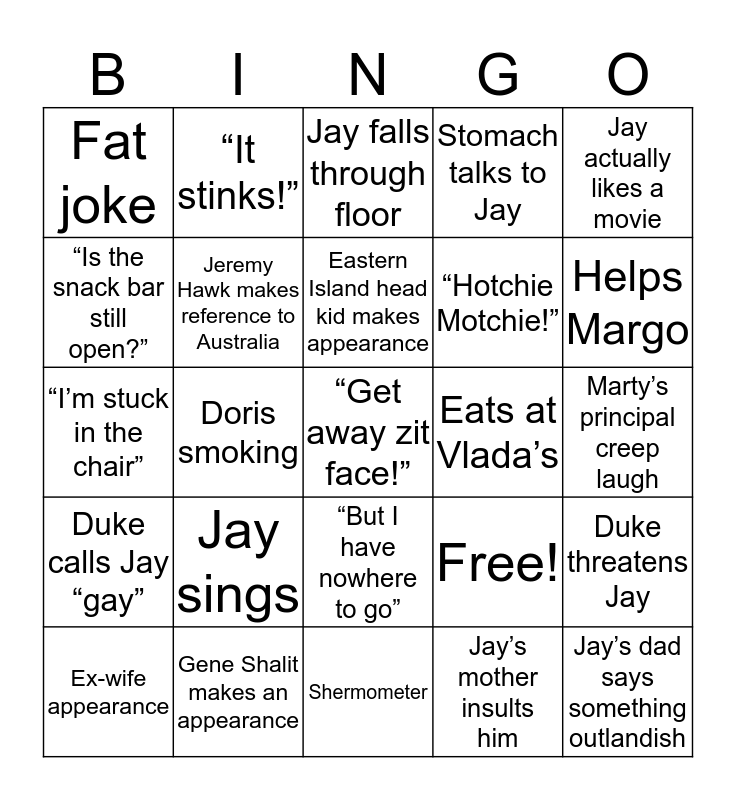 This bingo card has 25 words: Jay sings, Shermometer, Eastern Island head kid makes appearance, Ex-wife appearance, Jay actually likes a movie, Fat joke, “Is the snack bar still open?”, “It stinks!”, Eats at Vlada’s, “But I have nowhere to go”, “Hotchie Motchie!”, “I’m stuck in the chair”, Free!, Duke threatens Jay, Jeremy Hawk makes reference to Australia, Jay’s dad says something outlandish, Marty’s principal creep laugh, Jay falls through floor, Helps Margo, Doris smoking, “Get away zit face!”, Gene Shalit makes an appearance, Duke calls Jay “gay”, Stomach talks to Jay and Jay’s mother insults him.