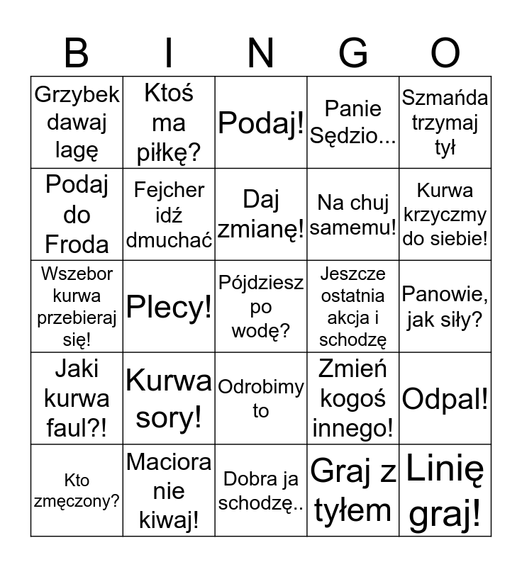 This bingo card has a free space and 24 words: Kurwa sory!, Maciora nie kiwaj!, Daj zmianę!, Kto zmęczony?, Szmańda trzymaj tył, Grzybek dawaj lagę, Podaj do Froda, Ktoś ma piłkę?, Jeszcze ostatnia akcja i schodzę, Odrobimy to, Na chuj samemu!, Wszebor kurwa przebieraj się!, Zmień kogoś innego!, Odpal!, Fejcher idź dmuchać, Graj z tyłem, Panowie, jak siły?, Podaj!, Kurwa krzyczmy do siebie!, Plecy!, Linię graj!, Jaki kurwa faul?!, Panie Sędzio... and Dobra ja schodzę...