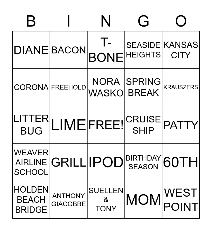 This bingo card has a free space and 24 words: GRILL, ANTHONY GIACOBBE, NORA WASKO, HOLDEN BEACH BRIDGE, KANSAS CITY, DIANE, CORONA, BACON, CRUISE SHIP, IPOD, SPRING BREAK, LITTER BUG, BIRTHDAY SEASON, 60TH, FREEHOLD, MOM, PATTY, T-BONE, KRAUSZERS, LIME, WEST POINT, WEAVER AIRLINE SCHOOL, SEASIDE HEIGHTS and SUELLEN & TONY.