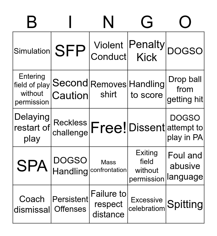 This bingo card has a free space and 24 words: DOGSO Handling, Persistent Offenses, Removes shirt, Coach dismissal, DOGSO, Simulation, Entering field of play without permission, SFP, Dissent, Mass confrontation, Handling to score, Delaying restart of play, Exiting field without permission, Foul and abusive language, Second Caution, Excessive celebratiom, DOGSO attempt to play in PA, Violent Conduct, Drop ball from getting hit, Reckless challenge, Spitting, SPA, Penalty Kick and Failure to respect distance.