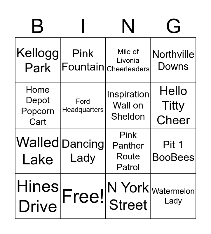 This bingo card has 16 words: Free!, Pit 1 BooBees, Mile of Livonia Cheerleaders, Kellogg Park, Walled Lake, Pink Fountain, Pink Panther Route Patrol, N York Street, Home Depot Popcorn Cart, Ford Headquarters, Hines Drive, Northville Downs, Dancing Lady, Hello Titty Cheer, Inspiration Wall on Sheldon and Watermelon Lady.