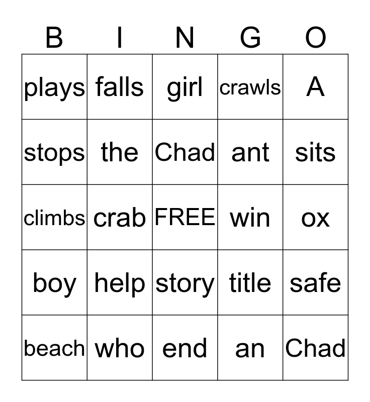 This bingo card has a free space and 24 words: help, who, Chad, beach, A, plays, stops, falls, win, story, ant, climbs, title, safe, the, an, ox, girl, sits, crab, Chad, boy, crawls and end.