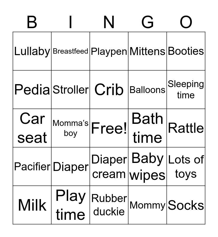 This bingo card has a free space and 34 words: Baby, Mommy, Daddy, Big brother, Pacifier, Stroller, Booties, Milk, Breastfeed, Formula, Crib, Playpen, Bassinet, Tummy time, Bath time, Sleeping time, Play time, Car seat, Diaper, Baby wipes, Diaper cream, Baby wash, Lullaby, Rattle, Rubber duckie, Socks, Mittens, Onesie, Balloons, Pedia, Daddy’s buddy, Momma’s boy, Lots of toys and Blessing.