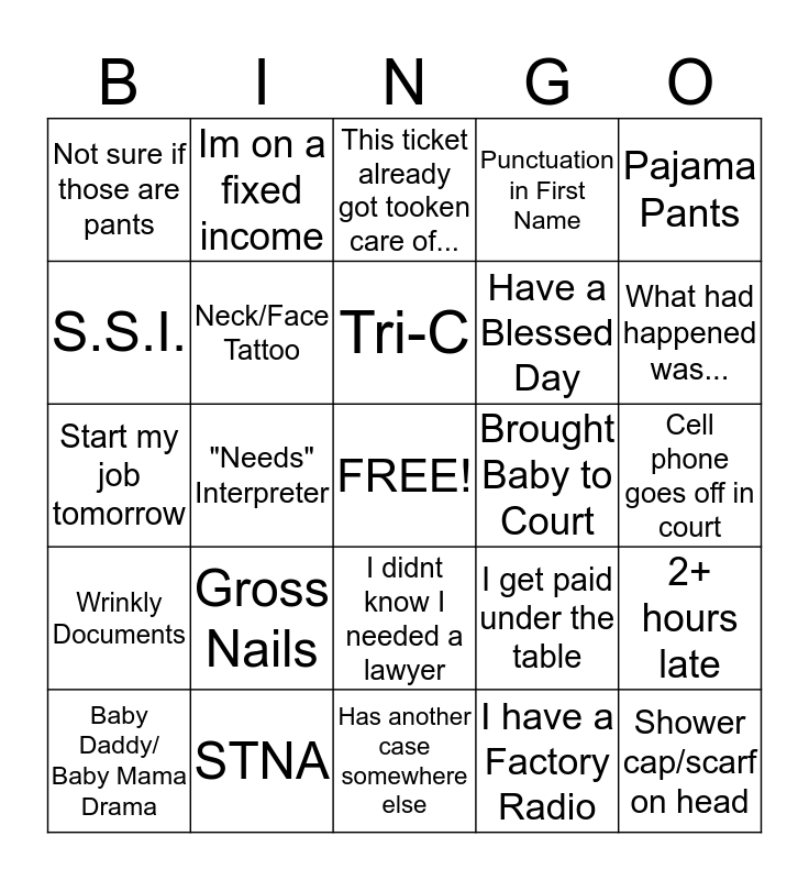 This bingo card has a free space and 24 words: Gross Nails, STNA, Tri-C, Baby Daddy/ Baby Mama Drama, Pajama Pants, Not sure if those are pants, S.S.I., Im on a fixed income, Brought Baby to Court, I didnt know I needed a lawyer, Have a Blessed Day, Start my job tomorrow, I get paid under the table, 2+ hours late, Neck/Face Tattoo, I have a Factory Radio, Cell phone goes off in court, This ticket already got tooken care of..., What had happened was..., "Needs" Interpreter, Shower cap/scarf on head, Wrinkly Documents, Punctuation in First Name and Has another case somewhere else.