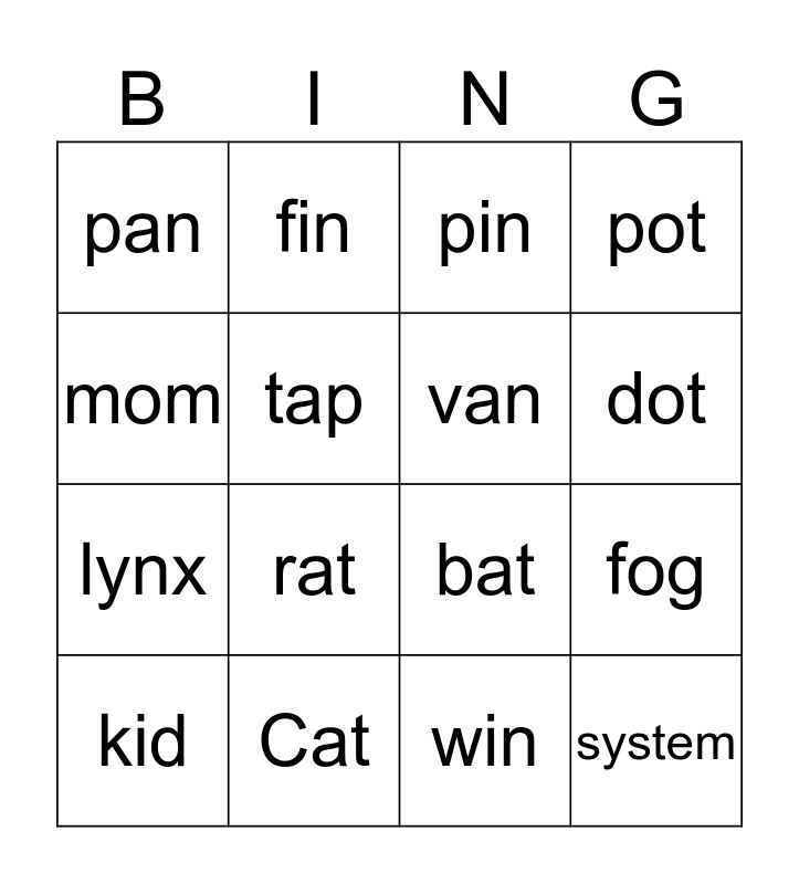 This bingo card has 16 words: Cat, fog, pin, pan, lynx, fin, bat, win, mom, tap, kid, pot, rat, dot, van and system.