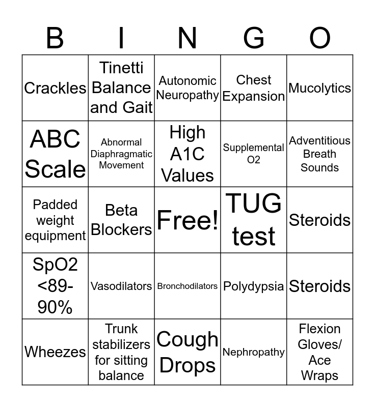 This bingo card has a free space and 30 words: Trunk stabilizers for sitting balance, Berg Balance Scale, Beta Blockers, Polyuria, Crackles, Autonomic Neuropathy, Abnormal Diaphragmatic Movement, Bronchodilators, TUG test, Cough Drops, Steroids, Flexion Gloves/ Ace Wraps, Nephropathy, Functional E-Stim for SCI pts, Adventitious Breath Sounds, Dynamic Gait Index, Polydypsia, SpO2 <89-90%, Vasodilators, Mucolytics, Padded weight equipment, Retinopathy, Tinetti Balance and Gait, Supplemental O2, ABC Scale, Chest Expansion, Steroids, Wheezes, High A1C Values and Glucosuria.