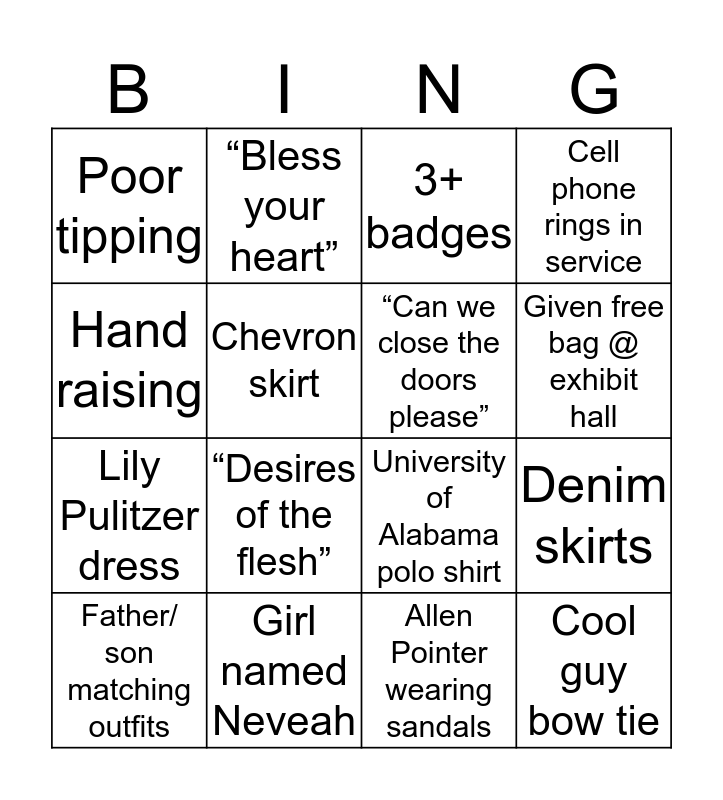 This bingo card has 20 words: Denim skirts, Big hair, 3+ badges, Old lady white pants, Father/ son matching outfits, Hand raising, Girl named Neveah, Poor tipping, Lily Pulitzer dress, “Bless your heart”, “Desires of the flesh”, University of Alabama polo shirt, Chevron skirt, Cool guy bow tie, “Can we close the doors please”, T&P holding quiet sign, Given free bag @ exhibit hall, Cell phone rings in service, Allen Pointer wearing sandals and Pastel sport Coat.