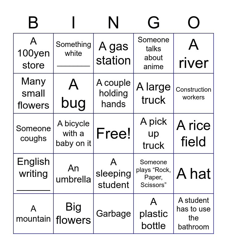 This bingo card has a free space and 39 words: A cat, A washroom, 2 Birds, A bug, A mountain, A sleeping student, A couple holding hands, Something blue _________, A river, English writing ______, A bicycle with a baby on it, Someone talks about anime, A student has to use the bathroom, A rice field, A pick up truck, An umbrella, Something red _________, A 100yen store, Bamboo, Someone plays “Rock, Paper, Scissors”, Many small flowers, Garbage, A large truck, Construction workers, A very old building, A forest, A senior citizen, A ramen restaurant, Someone uses a tissue, Something white ________, An airplane, A convenience store, A gas station, Big flowers, A plastic bottle, A cloud shaped like something _________, A hat, Someone coughs and Two books.