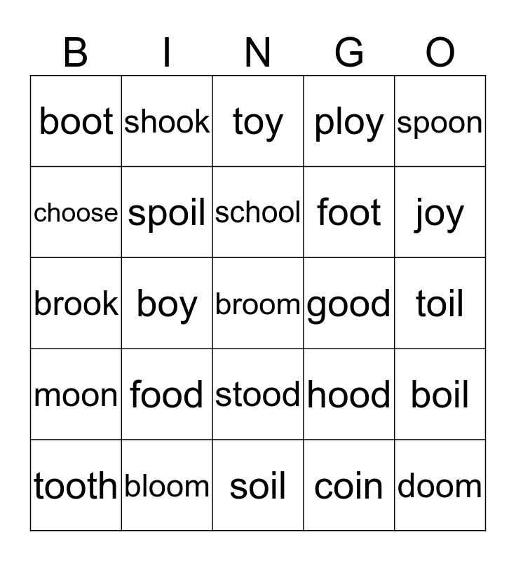 This bingo card has a free space and 24 words: food, bloom, school, tooth, spoon, boot, choose, shook, good, stood, foot, brook, hood, boil, spoil, coin, toil, toy, joy, boy, doom, moon, ploy and soil.