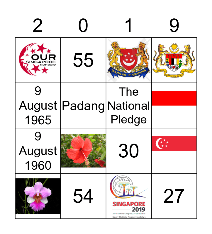 This bingo card has 10 images and 11 words: Majulah Singapura, 9 August 1965, 54, 9 August 1960, 55, 30, Padang, 27, The National Pledge, Encik Zubir Said and National Stadium.