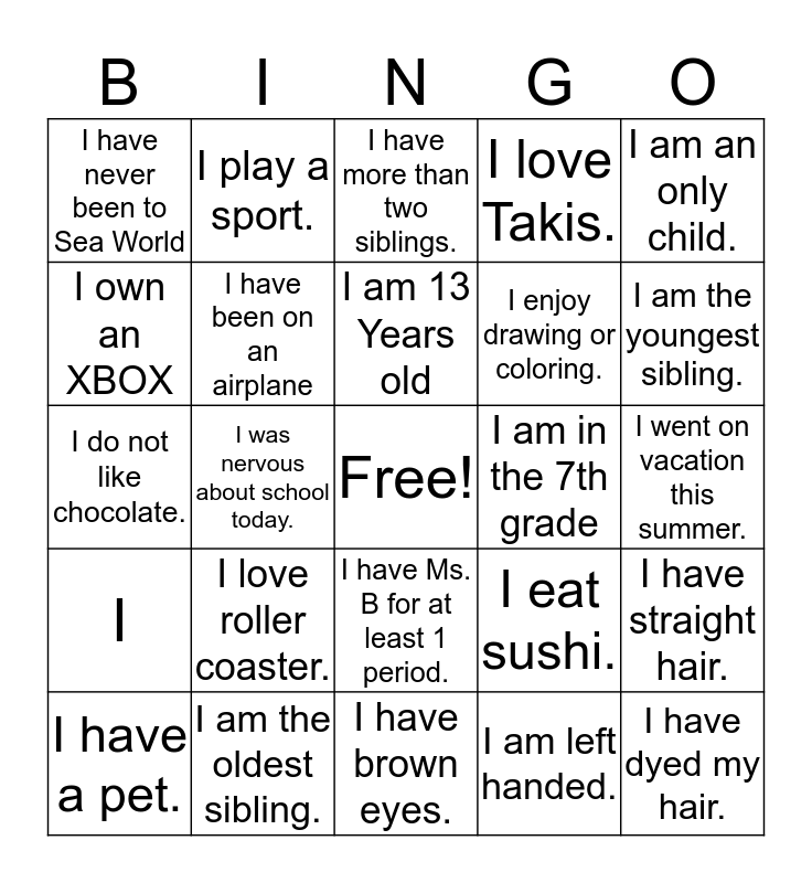 This bingo card has a free space and 34 words: I am in the 8th grade., I am left handed., My favorite subject is Math., My favorite sport is football., I, I have been on an airplane, I am an only child., I have a pet., I play a sport., I have had surgery., I am 13 Years old, I have more than two siblings., I cannot swim, I walk to school., I am in the 7th grade, I am the youngest sibling., I am the oldest sibling., I do not like chocolate., I love roller coaster., I eat sushi., I have Ms. B for at least 1 period., I play video games everyday., I have never been to Sea World, I went on vacation this summer., I have brown eyes., I have dyed my hair., I love Takis., My best friend goes to SYMS., I enjoy drawing or coloring., I own an XBOX, I own a Playstation, I was nervous about school today., I have straight hair. and I really like my class schedule..