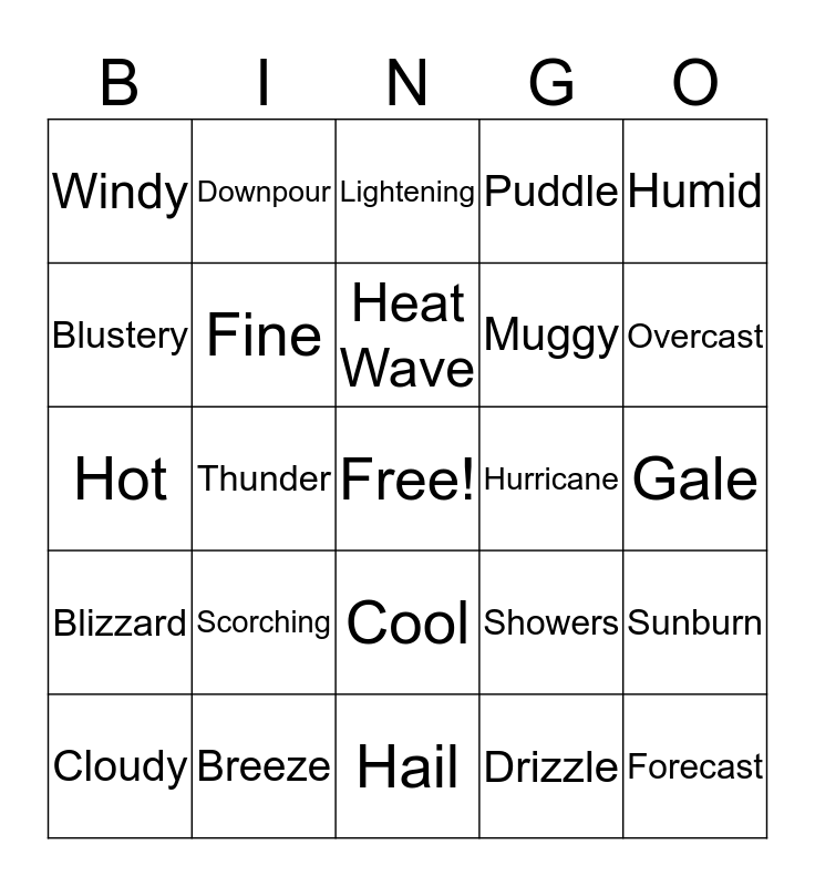 This bingo card has a free space and 38 words: Bright, Sunny, Clear, Fine, Sunburn, Scorching, Heat Wave, Mist, Humid, Muggy, Thunder, Puddle, Forecast, Gale, Blustery, Blizzard, Rainbow, Lightening, Drought, Hurricane, Windy, Breeze, Overcast, Cloudy, Freezing, Hail, Flood, Foggy, Gloomy, Snowflake, Sleet, Cool, Drizzle, Downpour, Warm, Showers, Hot and Thunder.
