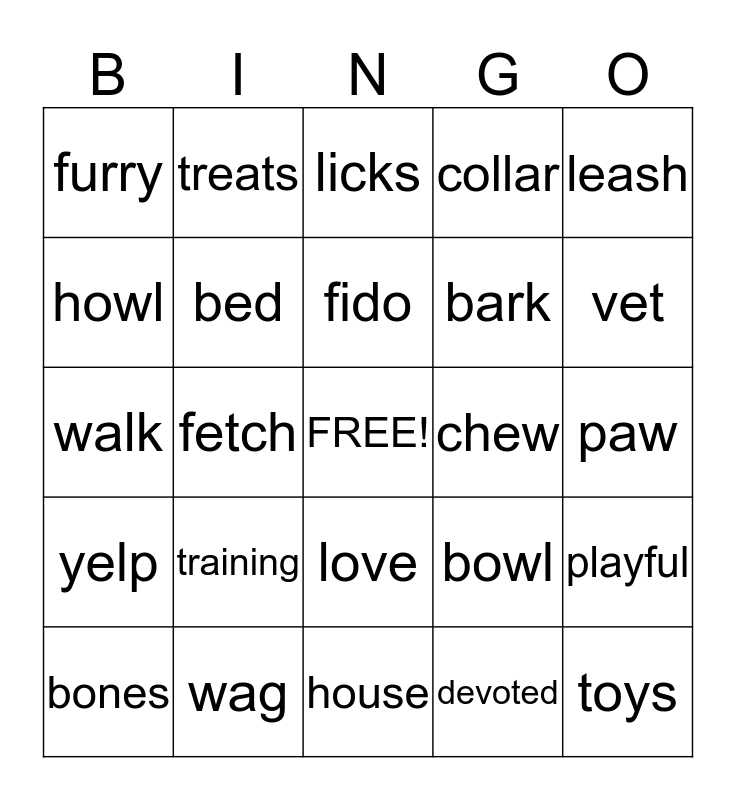 This bingo card has a free space and 24 words: training, wag, fido, bones, leash, furry, howl, treats, chew, love, bark, walk, bowl, playful, bed, devoted, paw, licks, vet, fetch, toys, yelp, collar and house.