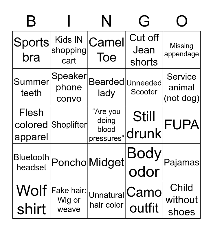 This bingo card has a free space and 24 words: Poncho, Fake hair: Wig or weave, Bearded lady, Wolf shirt, Missing appendage, Sports bra, Summer teeth, Kids IN shopping cart, Still drunk, Midget, Unneeded Scooter, Flesh colored apparel, Body odor, Pajamas, Speaker phone convo, Camo outfit, FUPA, Camel Toe, Service animal (not dog), Shoplifter, Child without shoes, Bluetooth headset, Cut off Jean shorts and Unnatural hair color.