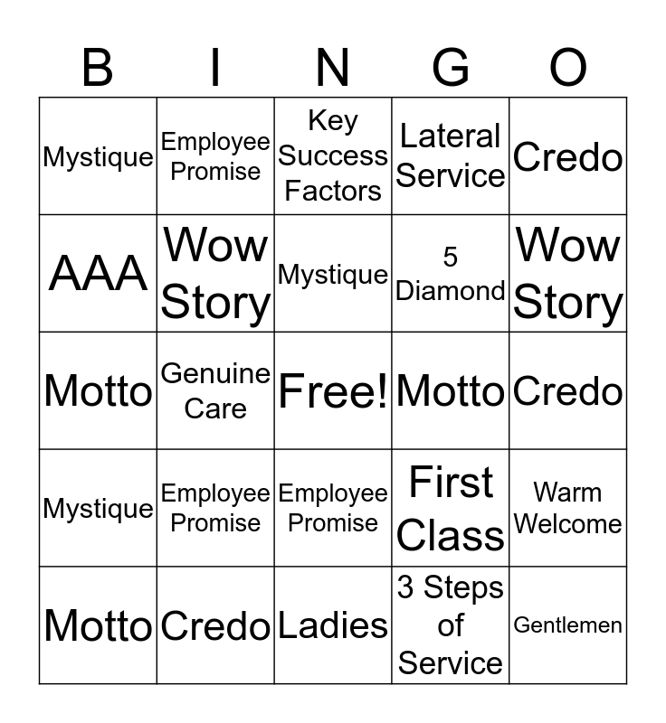 This bingo card has a free space and 34 words: Credo, 3 Steps of Service, First Class, Wow Story, Mystique, Wow Story, Credo, Motto, Employee Promise, Key Success Factors, Mystique, Key Success Factors, First Class, Wow Story, Motto, Wow Story, Credo, Motto, Employee Promise, First Class, Employee Promise, 2 Steps of Service, Mystique, Credo, Ladies, Gentlemen, Lateral Service, Privacy, 5 Diamond, AAA, BSA, Genuine Care, Warm Welcome and Fond Farewell.
