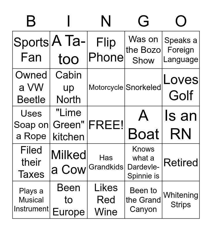This bingo card has a free space and 24 words: Milked a Cow, Been to Europe, Motorcycle, Plays a Musical Instrument, Speaks a Foreign Language, Sports Fan, Owned a VW Beetle, A Ta-too, A Boat, Has Grandkids, Snorkeled, Uses Soap on a Rope, Knows what a Dardevle-Spinnie is, Retired, Cabin up North, Been to the Grand Canyon, Is an RN, Flip Phone, Loves Golf, "Lime Green" kitchen, Whitening Strips, Filed their Taxes, Was on the Bozo Show and Likes Red Wine.
