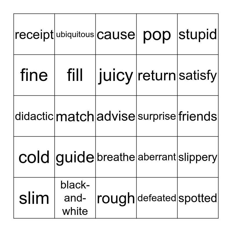 This bingo card has 50 words: panicky, advise, melt, rough, guide, chunky, ubiquitous, far, fine, stamp, fill, pop, slippery, aberrant, pathetic, instrument, juicy, surprise, pet, stupid, match, defeated, receipt, return, unusual, spotted, satisfy, waiting, cause, breathe, suspect, ad hoc, sheep, servant, black-and-white, faded, bewildered, enjoy, homely, friends, excite, divergent, spoon, finicky, slim, didactic, mug, downtown, cold and hobbies.