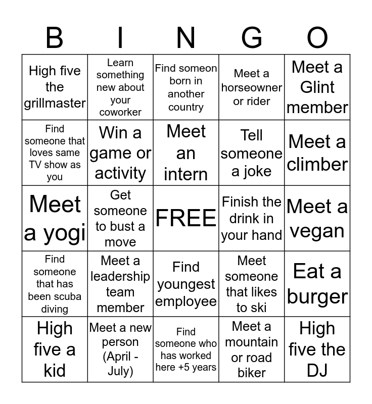 This bingo card has a free space and 24 words: Meet a leadership team member, Meet a new person (April - July), Meet an intern, High five a kid, Meet a Glint member, High five the grillmaster, Find someone that loves same TV show as you, Learn something new about your coworker, Finish the drink in your hand, Find youngest employee, Tell someone a joke, Meet a yogi, Meet someone that likes to ski, Eat a burger, Win a game or activity, Meet a mountain or road biker, Meet a vegan, Find someon born in another country, Meet a climber, Get someone to bust a move, High five the DJ, Find someone that has been scuba diving, Meet a horseowner or rider and Find someone who has worked here +5 years.