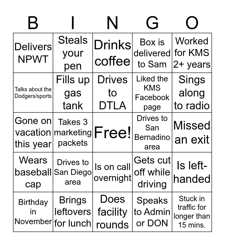 This bingo card has a free space and 29 words: Birthday in November, Drives one of the big trucks, Takes 3 marketing packets, Does more than 4 stops in a day, Delivers NPWT, Drinks coffee, Fills up gas tank, Drives to San Diego area, Drives to San Bernadino area, Brings leftovers for lunch, Missed an exit, Stuck in traffic for longer than 15 mins., Does facility rounds, Speaks to Admin or DON, Sings along to radio, Born in a different state/country, Is on call overnight, Wears baseball cap, Worked for KMS 2+ years, Gone on vacation this year, Gets cut off while driving, Responds to email 1+ hours later, Liked the KMS Facebook page, Talks about the Dodgers/sports, Box is delivered to Sam, Steals your pen, Is left-handed, Drives to DTLA and Takes van/truck home for night.