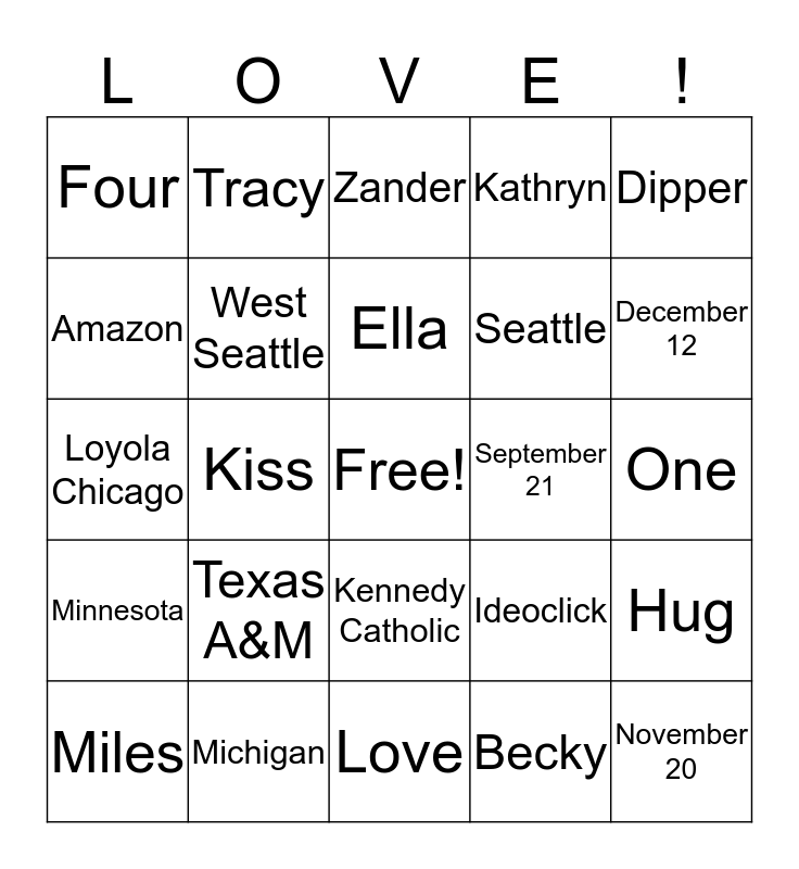 This bingo card has a free space and 34 words: Matt, Becky, Chicago, Texas, Minnesota, West Seattle, Dipper, Miles, Tracy, Mark, Ella, Zander, Bryan, Carol, September 21, December 12, Michigan, Loyola Chicago, Texas A&M, Ideoclick, Kennedy Catholic, August 3, Four, One, Love, November 20, Kathryn, Adrienne, Seattle, Amazon, Graphic Designer, Kiss, Hug and Family.
