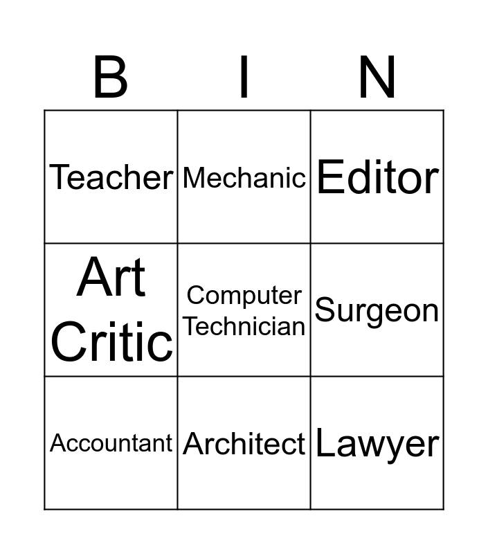 This bingo card has 9 words: Accountant, Editor, Mechanic, Art Critic, Teacher, Surgeon, Computer Technician, Lawyer and Architect.