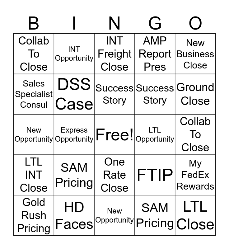 This bingo card has a free space and 24 words: SAM Pricing, HD Faces, Success Story, Gold Rush Pricing, New Business Close, Collab To Close, Sales Specialist Consul, INT Opportunity, LTL Opportunity, One Rate Close, Success Story, New Opportunity, FTIP, My FedEx Rewards, DSS Case, SAM Pricing, Collab To Close, INT Freight Close, Ground Close, Express Opportunity, LTL Close, LTL INT Close, AMP Report Pres and New Opportunity.