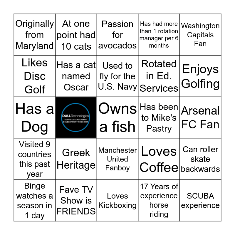 This bingo card has 2 images and 40 words: Lived in Brazil for 2 Years, Used to fly for the U.S. Navy, Grew up in Florida, Greek Heritage, 17 Years of experience horse riding, Can roller skate backwards, Owns a fish, Former College athlete, Passion for avocados, Manchester United Fanboy, Arsenal FC Fan, Enjoys Golfing, Washington Capitals Fan, Takes Annual Road Trips, Loves Coffee, Favorite Color is Dell Blue, Has a Dog, Knows 5 Languages, At one point had 10 cats, Likes Disc Golf, Hiked the Grand Canyon, SCUBA experience, Originally from Maryland, Has left a 1-star Google review, Rotated w/ Melanie Vogel, Rotated in Ed. Services, Rotated in Consulting, Has a degree from U. Tenn, Enjoys Baking, Lived in Brazil, Visited 9 countries this past year, Has a cat named Oscar, Loves Kickboxing, Knows how to surf, Binge watches a season in 1 day, Fave TV Show is FRIENDS, Has been to Mike's Pastry, Sang in High School Chorus, Aspiring luthier and Has had more than 1 rotation manager per 6 months.