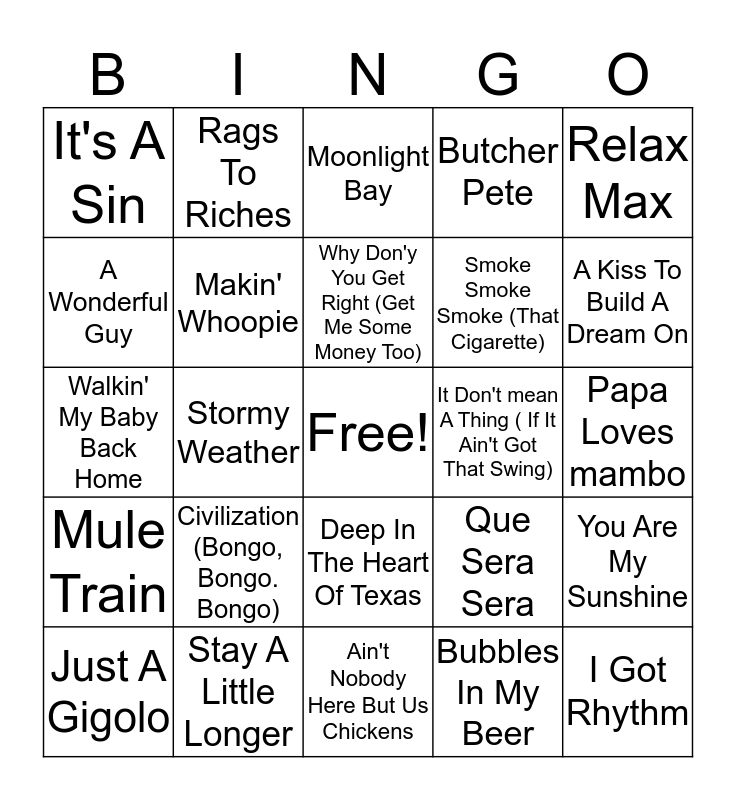 This bingo card has a free space and 79 words: In The Mood, Fly me To The Moon, Moonlight Bay, Mack The Knife, Beyond The Sea, Mr. Sandman, Bei Mir Bist Du Schoen, As-Cent-Tchu-Ate The Positive, Java Jive, Dear hearts & Gentle People, Big Iron, Crazy She Calls Me, Butcher Pete, It's A Sin, Pistol Packin' Mama, A Wonderful Guy, Rum & Coca-Cola, Civilization (Bongo, Bongo. Bongo), Banana Split For My Baby, Papa Loves mambo, Boogie Woogie Bugle Boy, Relax Max, Walkin' My Baby Back Home, Why Don'y You Get Right (Get Me Some Money Too), Makin' Whoopie, Whistle Stop, Oh Marie, There's A Pawnshop On The Corner In Pittsburgh PA, Sway, Cheek To Cheek, A Kiss To Build A Dream On, There Will Never be Another You, Ain't Nobody Here But Us Chickens, Caldonia, Just A Gigolo, It Don't mean A Thing ( If It Ain't Got That Swing), More, Let There be Love, Clementine, I Got Rhythm, Hello Dolly, Some Of These Days, Minnie The Moocher, The Lady Is A Tramp, Put On A Happy Face, Rags To Riches, I'm So Lonesome I Could Cry, Hey Good Lookin', Paper Doll, Don't Fence me In, You Are My Sunshine, Stormy Weather, Que Sera Sera, By The Light Of The Silv'ry Moon, Shaking The Blues Away, Pillow Talk, Get Your Kicks On Route 66, The best Things In Life Are Free, Tumbling Tumbleweeds, Deep In The Heart Of Texas, Smoke Smoke Smoke (That Cigarette), Move It On Over, Shot-Gun Boogie, I Saw The Light, Talk An Old Cold Tater (And Wait), Blue Moon Of Kentucky, Too Old To Cut The Mustard, If You've Got The Money I've Got The Time, Honky Tonkin', Mule Train, Stay A Little Longer, Chatanooga Shoe Shine Boy, Riders In The Sky, Cotton Eyed Joe, Mind Your Own Business, Bubbles In My Beer, Old Rattler, Mountain Dew and Personality.