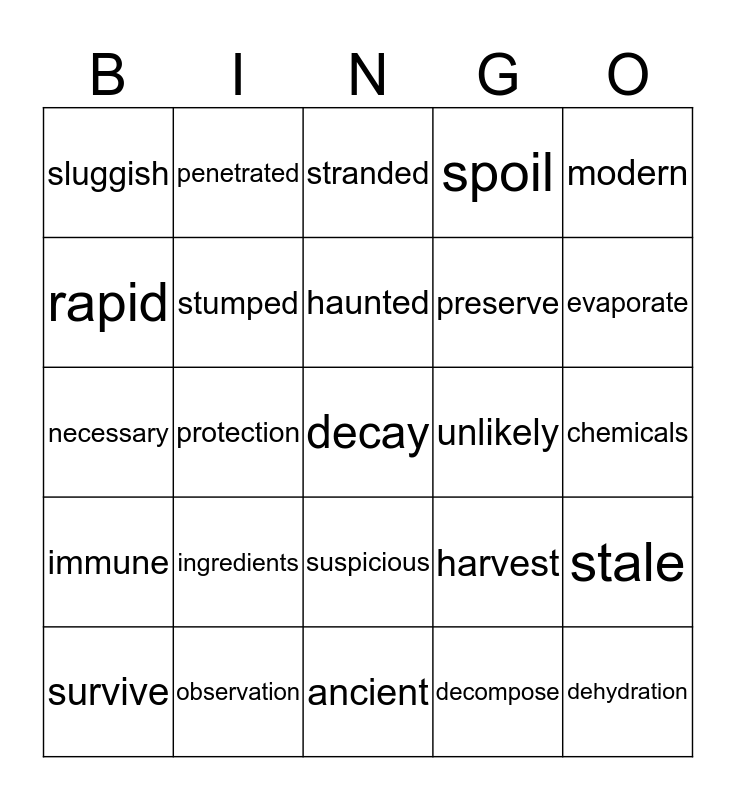 This bingo card has 30 words: observation, positive, protection, provide, sluggish, stranded, stumped, suspicious, unlikely, ancient, chemicals, decay, decompose, dehydration, evaporate, exposure, harvest, immune, ingredients, modern, necessary, particularly, penetrated, preserve, rapid, spoil, stale, survive, haunted and impossible.