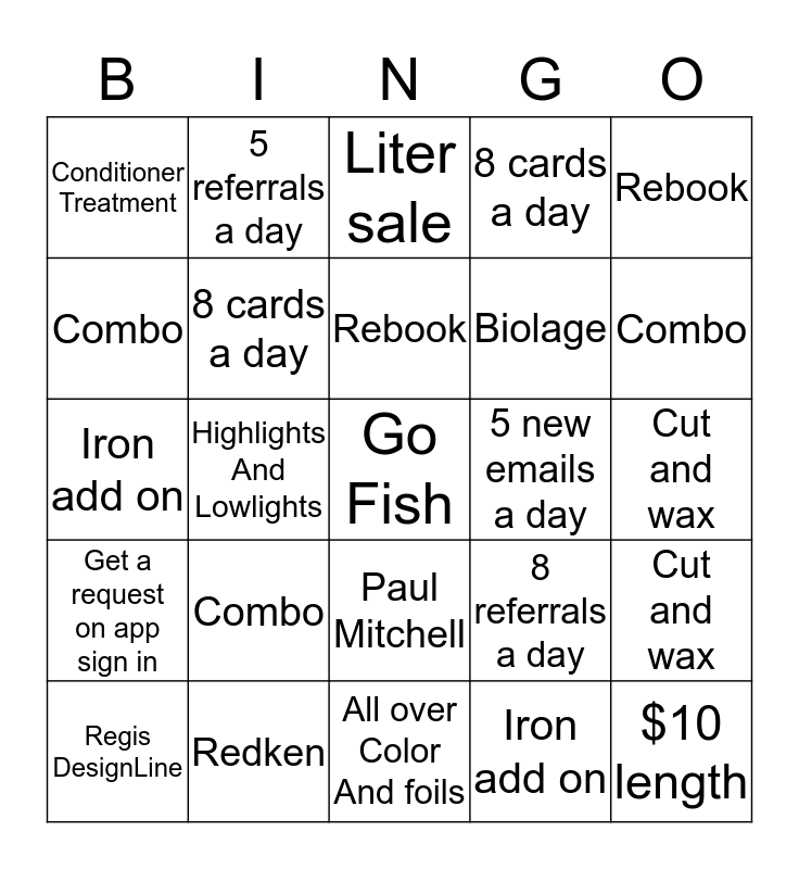 This bingo card has a free space and 29 words: Regis DesignLine, $10 Lenght, Highlights And Lowlights, 2 area wax, Conditioner Treatment, Liter sale, 8 cards a day, Combo, 5 new emails a day, Redken, Cut and wax, $10 length, All over Color And foils, Iron add on, Combo, Big sexy, Paul Mitchell, Get a request on app sign in, Rebook, Iron add on, 8 referrals a day, Rebook, Biolage, Combo, 8 cards a day, 5 referrals a day, Cut and wax, Rebook and Get a request on app sign in.