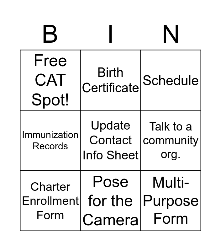This bingo card has 9 words: Charter Enrollment Form, Schedule, Birth Certificate, Immunization Records, Free CAT Spot!, Talk to a community org., Update Contact Info Sheet, Multi-Purpose Form and Pose for the Camera.