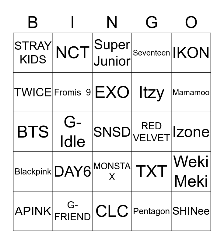 This bingo card has a free space and 24 words: DAY6, G-FRIEND, EXO, APINK, IKON, STRAY KIDS, TWICE, NCT, RED VELVET, MONSTA X, Itzy, BTS, TXT, Weki Meki, Fromis_9, Pentagon, Izone, Super Junior, Mamamoo, G-Idle, SHINee, Blackpink, Seventeen and CLC.