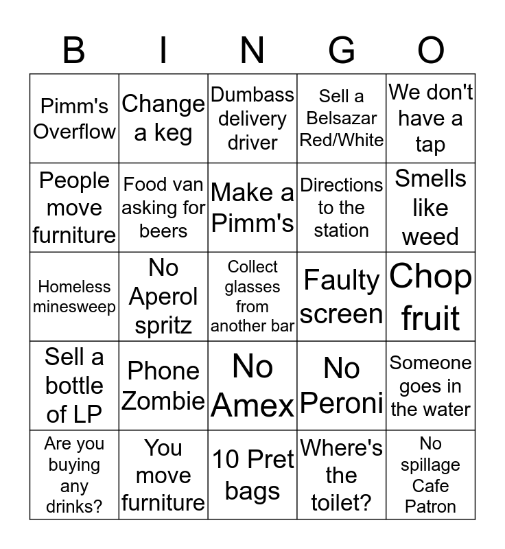 This bingo card has 26 words: No Amex, Where's the toilet?, Make a Pimm's, You move furniture, We don't have a tap, Pimm's Overflow, People move furniture, Change a keg, Chop fruit, No Peroni, Directions to the station, Homeless minesweep, Someone goes in the water, Are you buying any drinks?, No Aperol spritz, 10 white shirt wankers, Sell a Belsazar Red/White, Sell a bottle of LP, Dumbass delivery driver, Collect glasses from another bar, Smells like weed, 10 Pret bags, Faulty screen, Phone Zombie, Food van asking for beers and No spillage Cafe Patron.