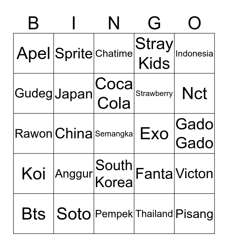 This bingo card has 25 words: Anggur, Pempek, Coca Cola, Bts, Indonesia, Apel, Gudeg, Sprite, Exo, South Korea, Strawberry, Rawon, Fanta, Victon, Japan, Pisang, Gado Gado, Chatime, Nct, China, Semangka, Soto, Koi, Stray Kids and Thailand.
