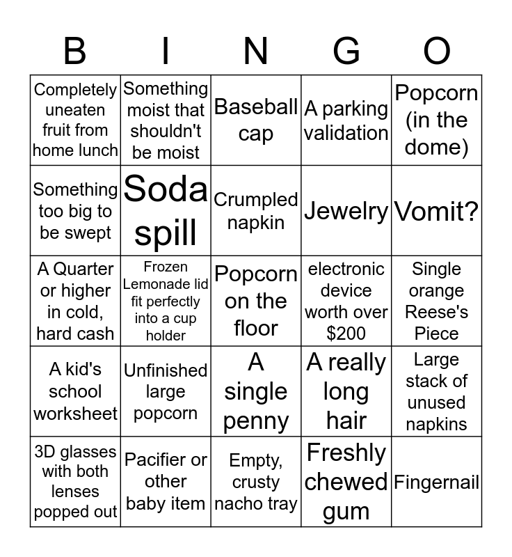This bingo card has a free space and 29 words: 3D glasses with both lenses popped out, Straw wrapper, Frozen Lemonade lid fit perfectly into a cup holder, Chewed sucker stick, Completely uneaten fruit from home lunch, Baseball cap, Soda spill, Unfinished large popcorn, electronic device worth over $200, Pacifier or other baby item, Single orange Reese's Piece, Fingernail, Empty, crusty nacho tray, Freshly chewed gum, Vomit?, Ticket stub, A single penny, A kid's school worksheet, Popcorn (in the dome), A Quarter or higher in cold, hard cash, A really long hair, Soggy Popcorn, Jewelry, Something too big to be swept, A parking validation, Something moist that shouldn't be moist, Large stack of unused napkins, Crumpled napkin and 1/3 of a pair of 3D glasses.