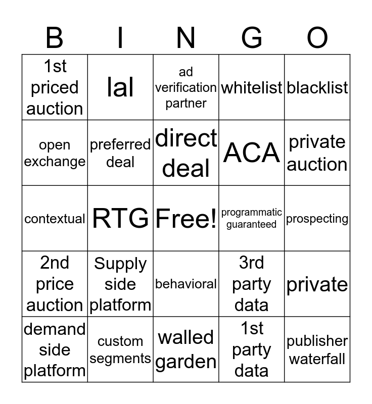 This bingo card has a free space and 24 words: Supply side platform, custom segments, direct deal, demand side platform, blacklist, 1st priced auction, open exchange, lal, programmatic guaranteed, behavioral, ACA, contextual, 3rd party data, private, preferred deal, 1st party data, prospecting, ad verification partner, private auction, RTG, publisher waterfall, 2nd price auction, whitelist and walled garden.