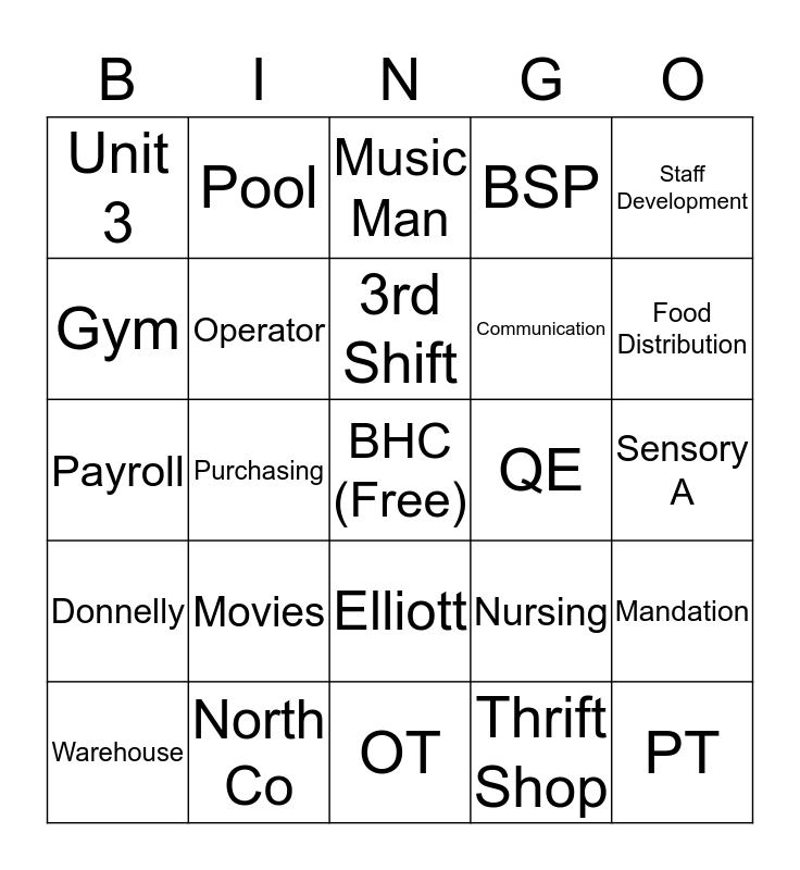 This bingo card has a free space and 54 words: Admin, Donnelly, DSP, Cottages, Elliott, Programming, BSP, 1:1, Gym, Unit 1, Unit 3, Dietary, North Co, Warehouse, PreVoc, OT, PT, Communication, Art Rm, Sensory A, Nursing, Psych, QE, Staff Development, ERRC, Pool, Maintenance, Dances, Picnic, Thrift Shop, Quarterly, ISP, Objectives, What's Cooking, Music Man, Sensory B, Payroll, Mandation, Timekeeping, Operator, 10695, CPR, First Aid, Safety Care, Movies, Fire Drill, 1st Shift, 2nd Shift, 3rd Shift, Purchasing, Food Distribution, Activity Aide, Senior Home and RC Soda.
