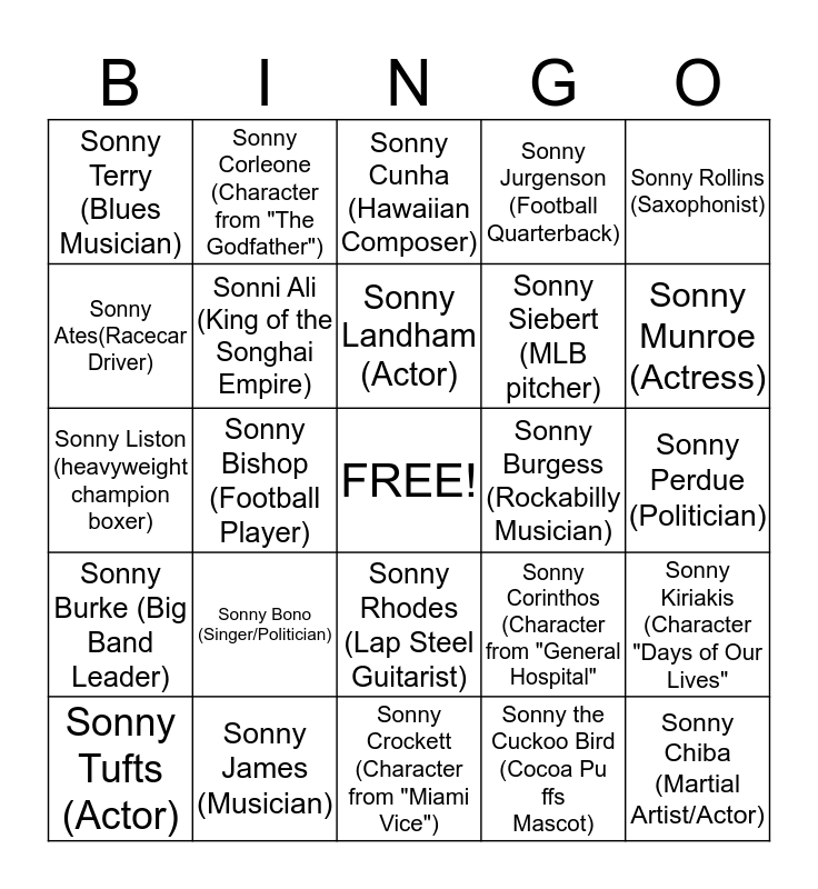 This bingo card has a free space and 24 words: Sonny Bono (Singer/Politician), Sonny James (Musician), Sonny Landham (Actor), Sonny Tufts (Actor), Sonny Rollins (Saxophonist), Sonny Terry (Blues Musician), Sonny Ates(Racecar Driver), Sonny Corleone (Character from "The Godfather"), Sonny Burgess (Rockabilly Musician), Sonny Rhodes (Lap Steel Guitarist), Sonny Siebert (MLB pitcher), Sonny Liston (heavyweight champion boxer), Sonny Corinthos (Character from "General Hospital", Sonny Kiriakis (Character "Days of Our Lives", Sonni Ali (King of the Songhai Empire), Sonny the Cuckoo Bird (Cocoa Puffs Mascot), Sonny Perdue (Politician), Sonny Cunha (Hawaiian Composer), Sonny Munroe (Actress), Sonny Bishop (Football Player), Sonny Chiba (Martial Artist/Actor), Sonny Burke (Big Band Leader), Sonny Jurgenson (Football Quarterback) and Sonny Crockett (Character from "Miami Vice").