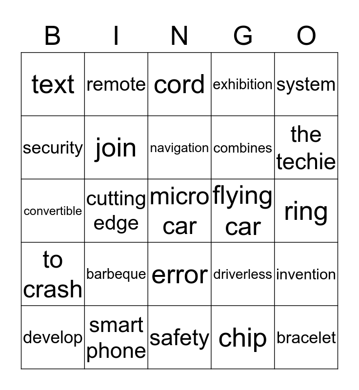 This bingo card has a free space and 24 words: barbeque, smart phone, navigation, develop, system, text, security, remote, flying car, error, combines, convertible, driverless, invention, join, chip, ring, cord, the techie, cutting edge, bracelet, to crash, exhibition and safety.