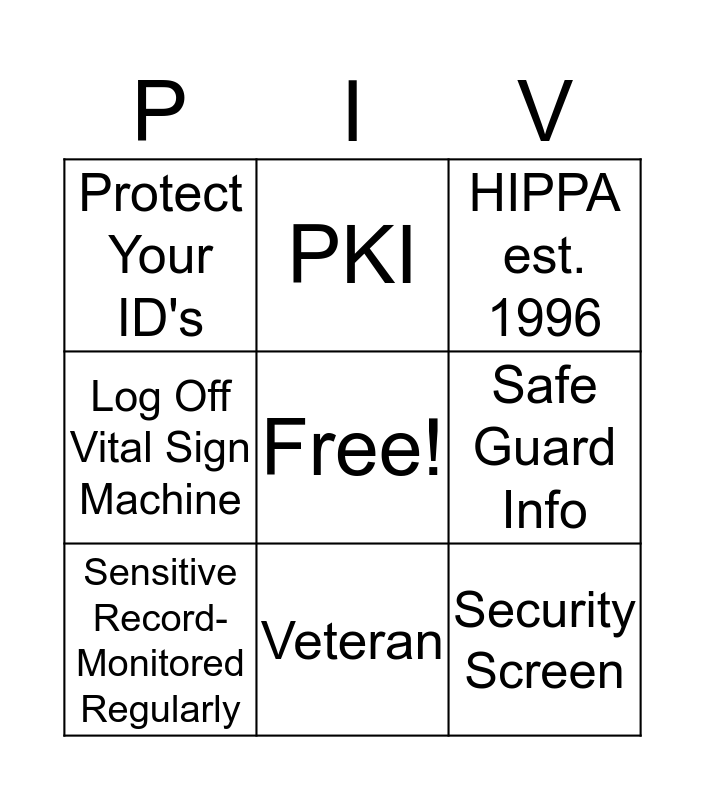 This bingo card has a free space and 26 words: Shred Documents, Be Proactive, Veteran, PHI, Security Screen, Protect Your ID's, Safe Guard Info, PKI, Retrieve Your items off FAX & Printer, Sensitive Record, 15 minute Lockout, CTL/ALT DEL, Log Out, PIV Card, Access Code, Verify Code, Log Off Vital Sign Machine, Strong Password, HIPPA est. 1996, Know Your Roll, Backup Data, Verify Before You Click, Privacy Officer D. Baczewski, Stay UTD on TMS Privacy Training, Sensitive Record- Monitored Regularly and 5 Sign On Attempts.