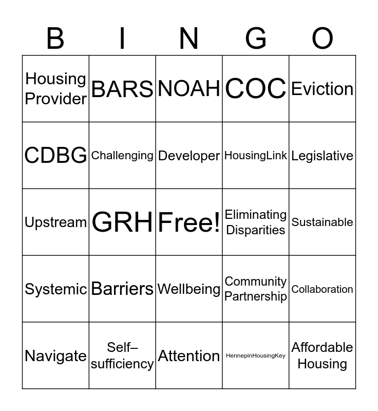 This bingo card has a free space and 51 words: 30% AMI, Affordable Housing, AHIF, Attention, Barriers, DHS, BARS, Budget, CDBG, CES 2.0, Challenging, COC, Collaboration, Community Partnership, Community Works, Couch Hopping, Developer, Eliminating Disparities, Encampment, Eviction, GRH, HennepinHousingKey, Housing Provider, HousingLink, HUD, Lead-based paint, Legislative, Market, Navigate, NOAH, Ownership, Partners, Person-Centered, Racial Inequity, Scope, Self–sufficiency, Shelter, Silo, Stability, Supportive Housing, Sustainable, Systemic, Teamwork, Tenant Selection Plan(s), Transit Oriented Development, Transition, Upstream, Volunteer, Waypoint, Wellbeing and Youth.