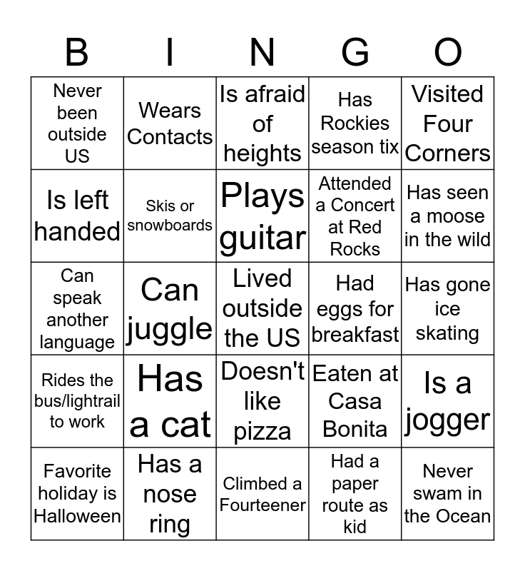 This bingo card has 50 words: Born in Colorado, Lived outside the US, Birthday in February, Climbed a Fourteener, Has a cat, Played sport in high school, Wears Contacts, Marched in a parade, Is left handed, Been to Broncos playoff game, Skis or snowboards, Has Rockies season tix, Is a jogger, Eaten at Casa Bonita, Attends theater regularly, Attended college in Colorado, Plays guitar, Had eggs for breakfast, Tells you a joke, Visited Four Corners, Can juggle, Had a paper route as kid, Never been outside US, Attended a Concert at Red Rocks, Climbed State Capital steps, Never swam in the Ocean, Has seen a moose in the wild, Has gone sky diving, Is afraid of heights, Doesn't like pizza, Has been in a hot air balloon, Uses the work gym, Plays piano, Has a tattoo, Has a nose ring, Has a dog, Been to Mt Rushmoore, Likes to play video games, Likes to read in spare time, Has gone ice skating, Owns a motorcycle or ATV, Owns a cowboy hat and/or boots, Enjoys a renaissance Festival, Can say a quote from the Princess Bride, Favorite holiday is Halloween, Can speak another language, Enjoys fishing, Favorite color is green, Rides the bus/lightrail to work and Tells you their favorite hobby.