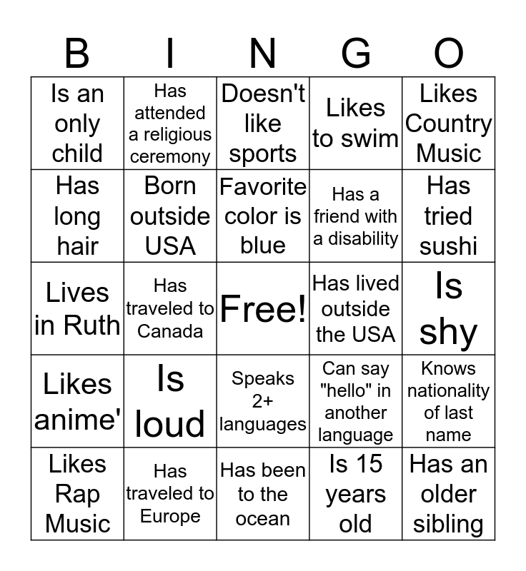 This bingo card has a free space and 24 words: Is loud, Has traveled to Europe, Favorite color is blue, Likes Rap Music, Likes Country Music, Is an only child, Has long hair, Has attended a religious ceremony, Has lived outside the USA, Speaks 2+ languages, Has a friend with a disability, Lives in Ruth, Can say "hello" in another language, Knows nationality of last name, Born outside USA, Is 15 years old, Is shy, Doesn't like sports, Has tried sushi, Has traveled to Canada, Has an older sibling, Likes anime', Likes to swim and Has been to the ocean.