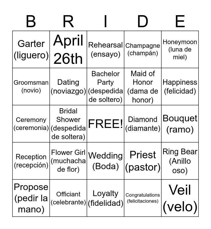 This bingo card has a free space and 65 words: Love (Amor), Francisco, Best Man (el padrino de boda), Ring Bear (Anillo oso), Toast (brindis), Engaged (Prometido), April 26th, Bridesmaid (dama de honor), Bachelor Party (despedida de soltero), First Dance (primer baile), Wedding (Boda), Bride (novia), Bouquet (ramo), Honeymoon (luna de miel), Groom (novio), Groomsman (novio), Bridal Shower (despedida de soltera), Garter (liguero), Jasmine, Maid of Honor (dama de honor), Flower Girl (muchacha de flor), Reception (recepción), Champagne (champán), Las Vegas, Dancing (Bailando), Cake (Pastel), Kiss (Beso), Wedding Dress (Vestido de novia), Veil (velo), Train (tren), Propose (pedir la mano), Ring (anillo), Church (iglesia), Altar (altar), Priest (pastor), Officiant (celebrante), Chapel (capilla), Ceremony (ceremonia), Congratulations (felicitaciones), Couple (pareja), Dating (noviazgo), Devotion (devocion), Diamond (diamante), Emerald (esmeralda), Family (familia), Favor (detalle), Happiness (felicidad), Heart (corazon), Honor (honor), Invitation (invitacion), Lace (encaje), License (licencia), Limousine (limosina), Loyalty (fidelidad), Marriage License (licencia matrimonial), Matrimony (matrimonio), Registry (registro), Rehearsal (ensayo), Romantic (romantico), Thank You (gracias), True love (amor real), Tuxedo (esmoquin), Wedding Bands (anillos matrimoniales), Husband (esposo) and Wife (esposa).