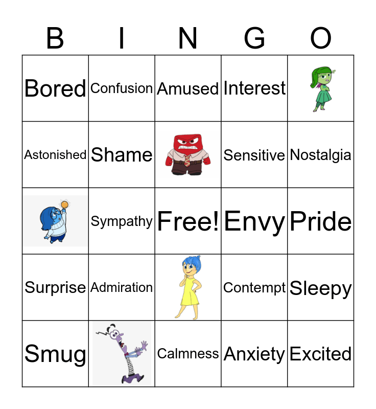 This bingo card has 5 images, a free space and 19 words: Admiration, Smug, Bored, Astonished, Confusion, Envy, Sensitive, Contempt, Sleepy, Shame, Anxiety, Pride, Amused, Nostalgia, Sympathy, Excited, Surprise, Interest and Calmness.