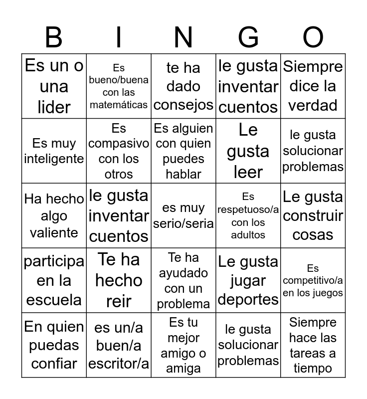 This bingo card has 25 words: Te ha hecho reir, Es tu mejor amigo o amiga, Es alguien con quien puedes hablar, En quien puedas confiar, Siempre dice la verdad, Es un o una lider, Es muy inteligente, Es bueno/buena con las matemáticas, Es respetuoso/a con los adultos, Te ha ayudado con un problema, Le gusta leer, Ha hecho algo valiente, Le gusta jugar deportes, Es competitivo/a en los juegos, Es compasivo con los otros, Siempre hace las tareas a tiempo, Le gusta construir cosas, te ha dado consejos, le gusta solucionar problemas, le gusta inventar cuentos, es muy serio/seria, es un/a buen/a escritor/a, participa en la escuela, le gusta inventar cuentos and le gusta solucionar problemas.