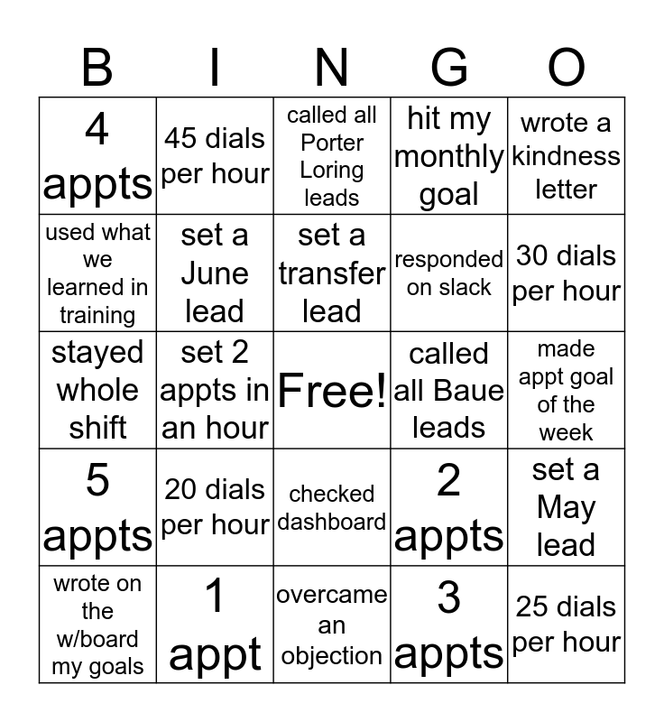 This bingo card has a free space and 24 words: 20 dials per hour, 1 appt, set a transfer lead, wrote on the w/board my goals, wrote a kindness letter, 4 appts, used what we learned in training, 45 dials per hour, called all Baue leads, checked dashboard, responded on slack, stayed whole shift, 2 appts, set a May lead, set a June lead, 3 appts, made appt goal of the week, called all Porter Loring leads, 30 dials per hour, set 2 appts in an hour, 25 dials per hour, 5 appts, hit my monthly goal and overcame an objection.