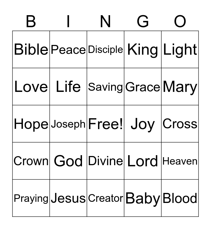 This bingo card has a free space and 24 words: God, Jesus, Saving, Praying, Light, Bible, Love, Peace, Joy, Divine, Grace, Hope, Lord, Heaven, Life, Baby, Cross, Disciple, Mary, Joseph, Blood, Crown, King and Creator.